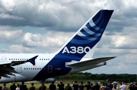 | Un Airbus A380 au salon de l'aéronautique de Farnborough, dans le sud-ouest de Londres (Grande-Bretagne), le 14 juillet. |