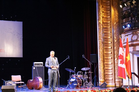 | Robert Bissett, chargé d’affaires à l’ambassade du Canada prononce son discours d’ouverture avant le début du concert, le 15 octobre à Hanoï. |