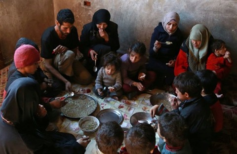 | Une famille partage un maigre repas à base de choux et de maïs dans la Ghouta orientale assiégée près de Damas, le 6 novembre. |