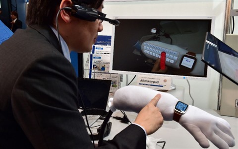| Un employé de NEC fait la démonstration d'un clavier virtuel à Tokyo le 11 novembre 2015. |