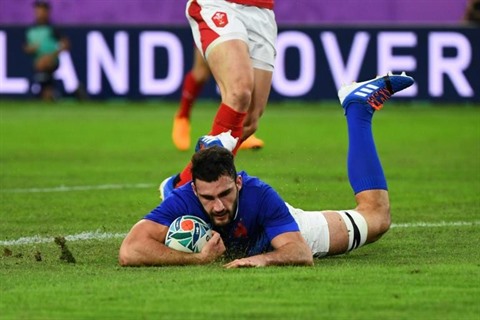 | Le centre du XV de France, Charles Ollivon, marque un essai lors du quart de finale du Mondial face au pays de Galles, à Oita au mois d’octobre 2019. |
