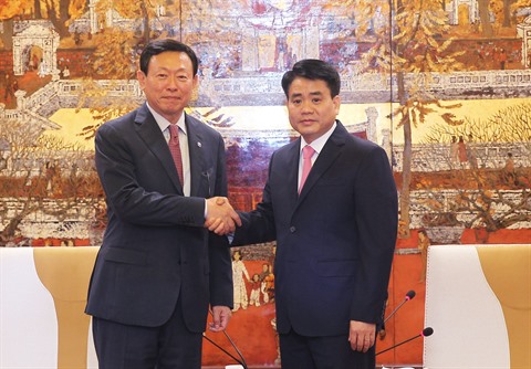 | Le président du groupe Lotte, Shin Dong-bin (gauche), reçu par le président du Comité populaire de Hanoï, Nguyên Duc Chung, le 3 décembre à Hanoï. |