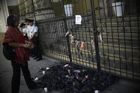 Pour montrer leur indignation, des militants des droits de l'homme ont manifesté jeudi 9 mars à proximité du palais présidentiel à Guatemala, versant du charbon et plaçant des poupées brûlées devant l'édifice.