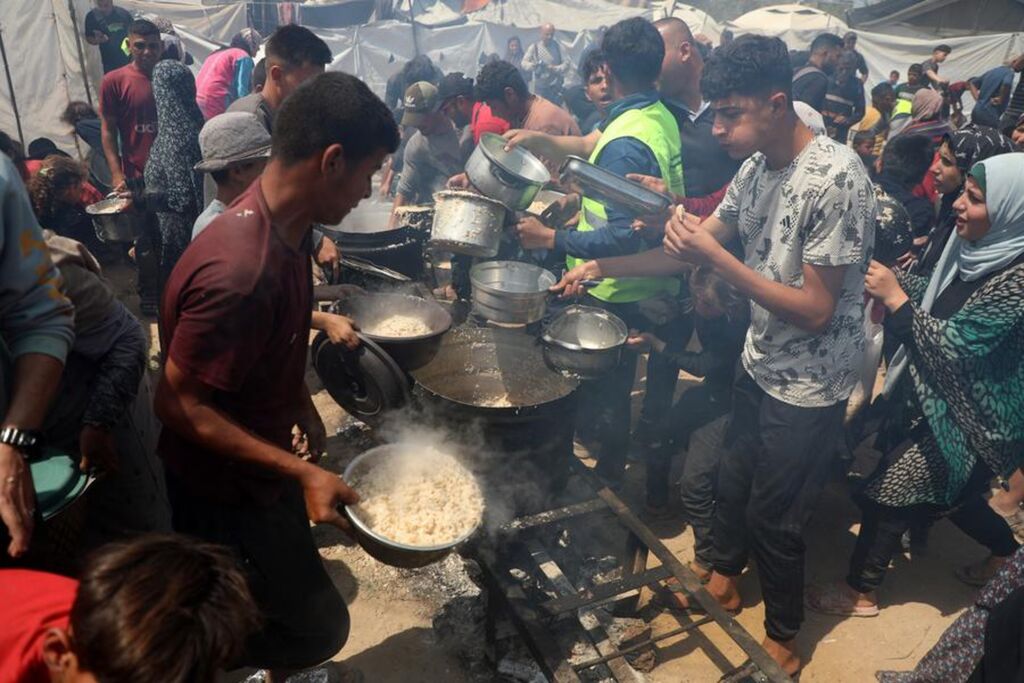 | Photo prise le 2 mai 2025 montrant des Palestiniens recevant de la nourriture gratuite dans un centre de distribution alimentaire à Gaza. |