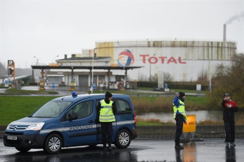 | Des gendarmes devant la raffinerie Total de Gonfreville-l'Orcher, près du Havre, après un incendie qui a été maîtrisé, le 14 décembre. |