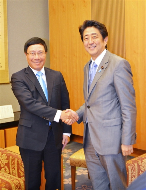 | Le ministre vietnamien des Affaires étrangères Pham Binh Minh (gauche) et le Premier ministre japonais Shinzo Abe, le 12 septembre |