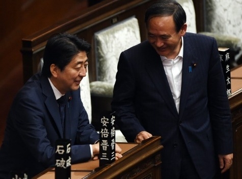 | Le Premier ministre japonais, Shinzo Abe (gauche), et son chef de cabinet Yoshihide Suga, le 18 septembre 2015. |