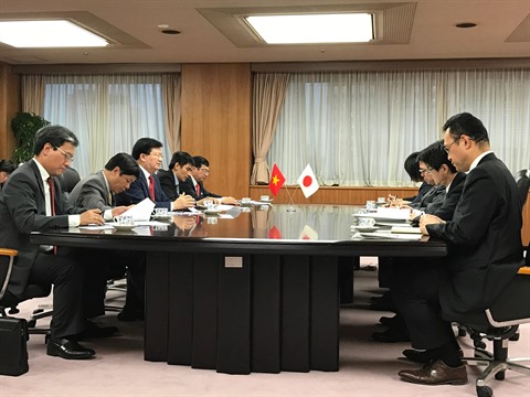 | Séance de travail entre le vice-Premier ministre vietnamien Trinh Dinh Dung (centre, côté gauche), et le ministre japonais de l’Économie, du Commerce et de l’Industrie, Hiroshige Seko. |