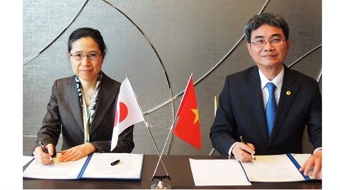 | Dinh Huu Phi (droite) et Naoko Munakata, chefs du NOIP et du JPO, signent l'accord de coopération entre leurs deux organes. |