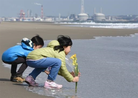 | Des enfants déposent des fleurs sur la plage de Sendai, au Japon, le 11 mars, en hommage aux victimes du séisme et du tsunami de 2011. |