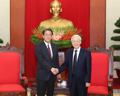 | Le secrétaire général du Parti communiste du Vietnam, Nguyên Phu Trong (droite), a reçu, mercredi 14 décembre à Hanoï, le nouvel ambassadeur japonais, Umeda Kunio. |