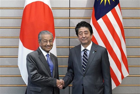 | Le Premier ministre malaisien Mahathir Mohamad (gauche) et son homologue japonais Shinzo Abe, le 31 mai à Tokyo. |