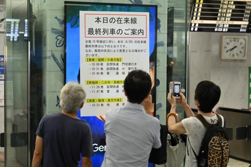 | Des voyageurs consultent un panneau indiquant les perturbations du trafic dues au typhon Shanshan, le 29 août dans la gare de Hakata à Fukuoka, dans l'île japonaise de Kyushu. |