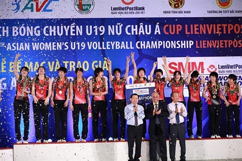 | L'équipe japonaise de volley-ball féminin monte sur la plus haute marche du podium du tournoi de volley-ball féminin U19 d'Asie tenu le 17 juin dans la province de Bac Ninh (Nord). |