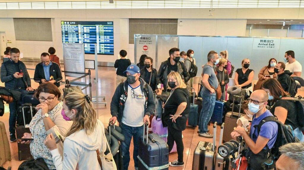 | Un groupe de touristes, à l'aéroport de Haneda, à Tokyo, le 10 octobre. |