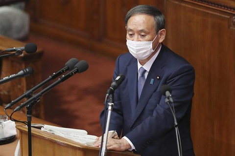 | Yoshihide Suga, lors de sa première prise de parole politique devant le Parlement depuis son arrivée au pouvoir en septembre, le 26 octobre. |