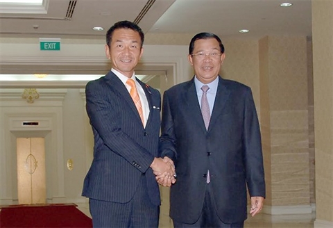 | Le Premier ministre cambodgien Samdech Hun Sen (droite) et le vice-ministre japonais des Affaires étrangères, Kiyoshi Odawara. |