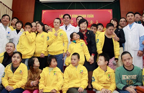 | Akie Abe (centre) entourrée des enfants handicapés et des cadres de l’Hôpital de réhabilitation de Hanoï. |