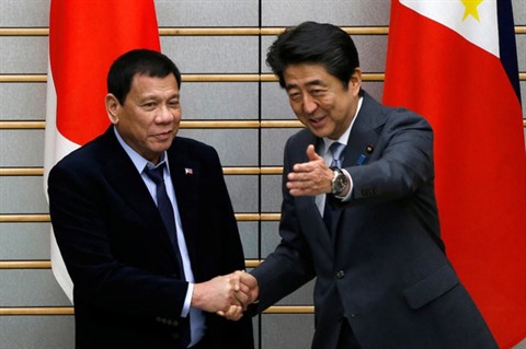 | Le Premier ministre japonais Shinzo Abe (droite) reçoit le président philippin Rodrigo Duterte. |