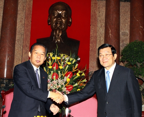 | Le président vietnamien Truong Tân Sang et le président de l'Alliance des parlementaires d'amitié Japon-Vietnam, Nikai Toshihiro. |