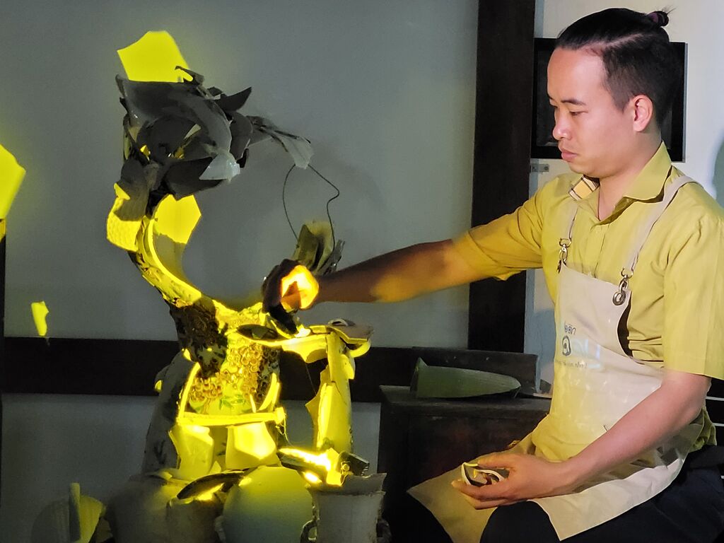 Dans son atelier situé dans le village de céramique de Bat Tràng, en banlieue de Hanoï, Bùi Van Tu, né en 1992, arrange méticuleusement des morceaux de poteries cassées et jetées. Puis, il se tourne vers la lampe posée à côté de lui et l’allume. De manière inattendue, un miracle se produit : l’image d’un potier en train de travailler apparaît sur le mur.
