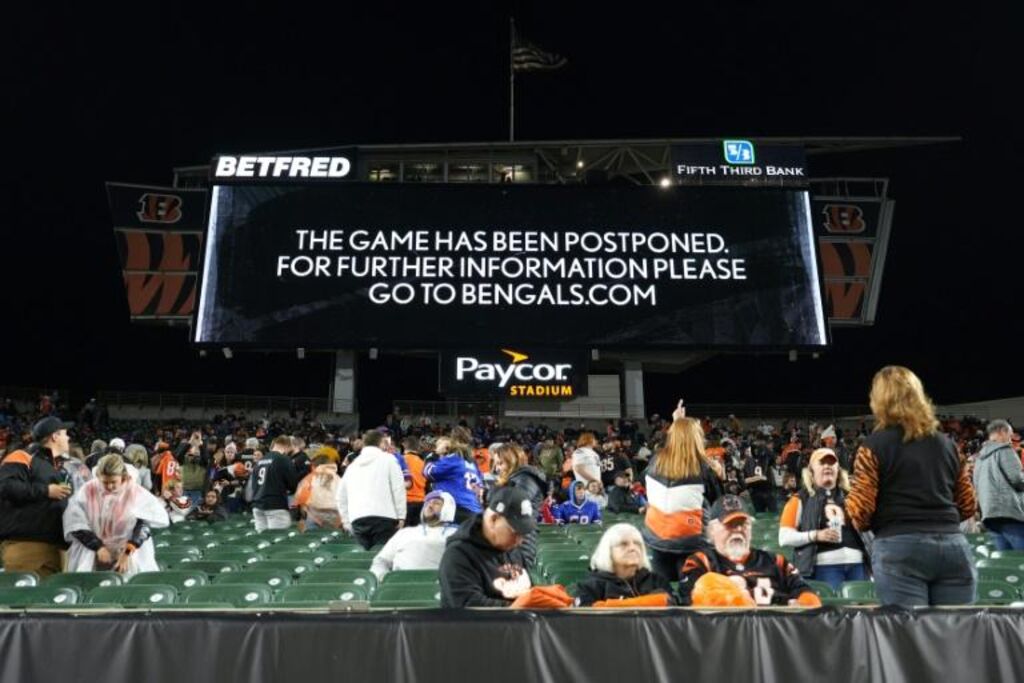 | Le tableau d'affichage annonçant le report du match entre Cincinnati et Buffalo, après le malaise d'un joueur des Bills en plein match de NFL, le 2 janvier à Cincinnati. |
