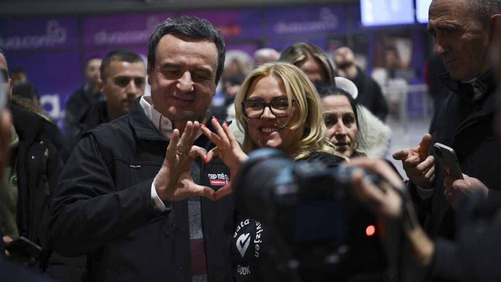 | Le Premier ministre du Kosovo, Albin Kurti (gauche), forme un cœur avec ses mains en accueillant le 8 février, à la veille des élections législatives, des partisans issus de la diaspora à l'aéroport international Adem Jashari, près de la capitale Pristina. |