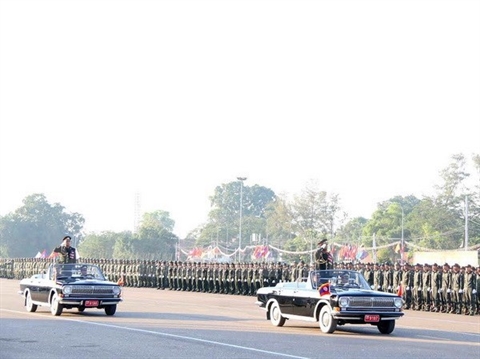 | La parade militaire lors de la cérémonie en l’honneur du 40e anniversaire de la Fête nationale du Laos, le 2 décembre à Vientiane. |
