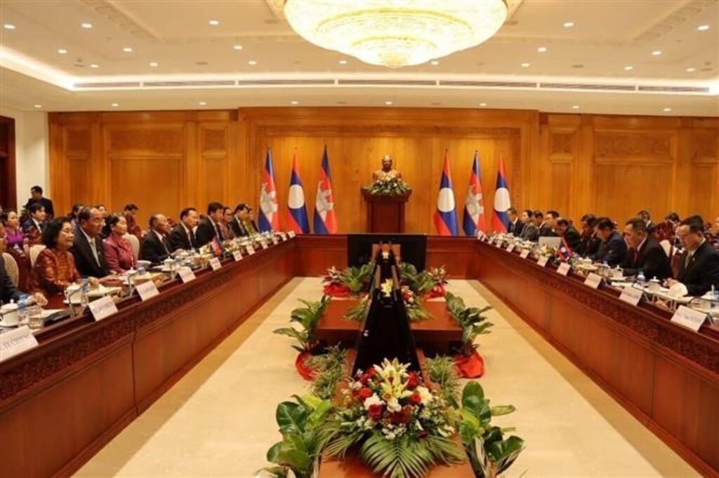| Entretien entre le président de l'Assemblée nationale cambodgienne Samdech Heng Samrin et son homologue laotien Xaysomphone Phomvihane à Vientiane le 14 septembre. |