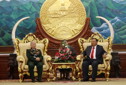 | Le secrétaire général du Parti populaire révolutionnaire et président du Laos, Bounnhang Vorachith (droite), a reçu à Vientiane le lieutenant-général Huynh Dac Huong. |