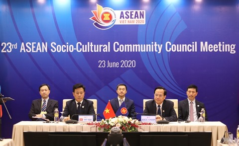 | Le ministre vietnamien du Travail, des Invalides et des Affaires sociales Dào Ngoc Dung (droite, 1er plan) préside la 23e Conférence du Conseil de la Communauté socio-culturelle de l'ASEAN en ligne. |