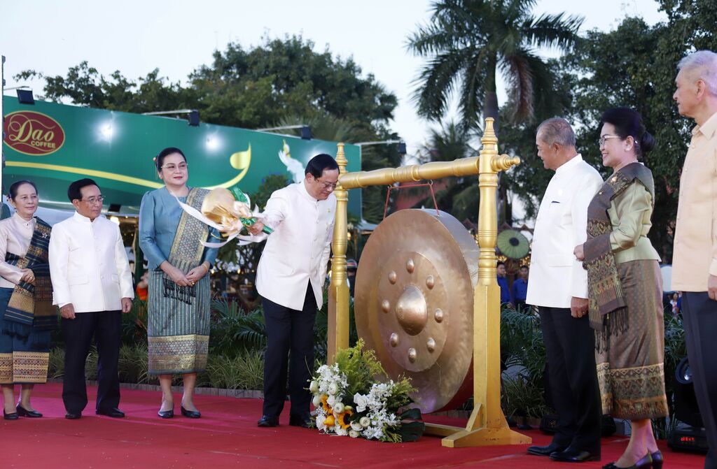 | Le Premier ministre lao Sonexay Siphandone bat le gong pour lancer l'Année touristique du Laos 2024. |