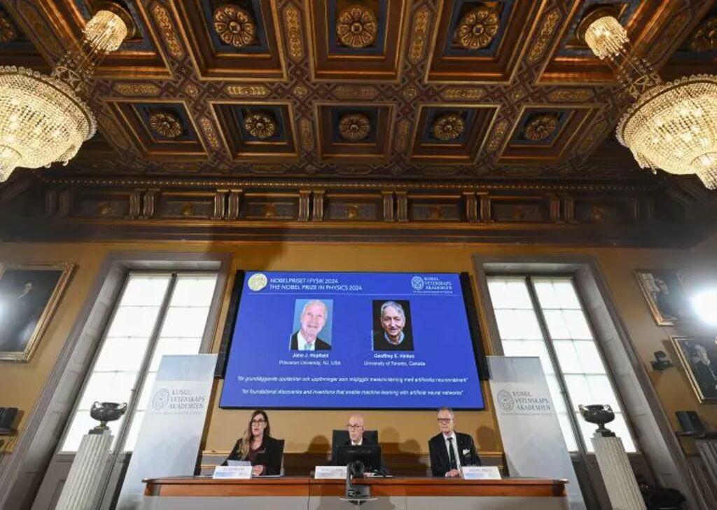 | Les deux lauréats du prix Nobel de physique, le Britanno-canadien Geoffrey Hinton et l'Américain John Hopfield, apparaissent sur un écran après l'annonce de leur récompense à Stockholm, le 8 octobre. |
