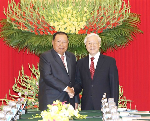 | Le secrétaire général du Parti populaire révolutionnaire du Laos, Bounnhang Vorachith (gauche), a été accueilli par le secrétaire général du Parti communiste Vietnam, Nguyên Phu Trong. |