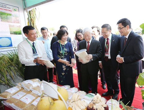 | Le secrétaire général du Comité central du PCV, Nguyên Phu Trong, visite les stands où se présentent les produits agricoles du Vietnam. |