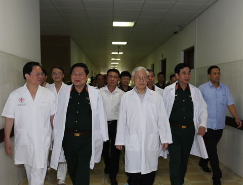 | Le secrétaire général du PCV, Nguyên Phu Trong (3e à droite), à l’Hôpital central militaire 108 à Hanoï, le 28 avril. |