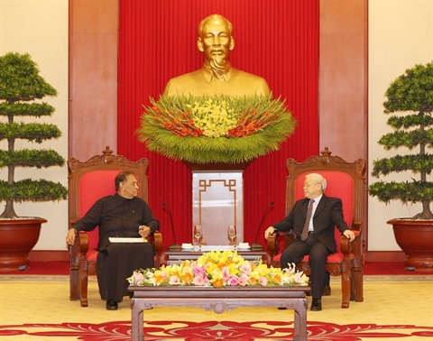 | Le président du Parlement sri-lankais Karu Jayasuriya (gauche) reçu le 24 avril à Hanoï par le secrétaire du PCV, Nguyên Phu Trong. |