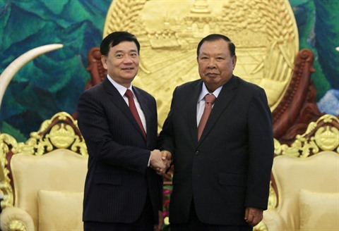 | Le secrétaire général du PPRL et président du Laos, Bounnhang Volachith (droite), et le président de l'Association d'amitié Vietnam - Laos, Trân Van Tuy, le 19 juillet à Vientiane. |