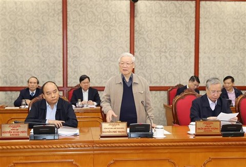 | Le secrétaire général et président de la République, Nguyên Phu Trong, (debout) s’exprime lors de la réunion à Hanoï, le 8 décembre. |