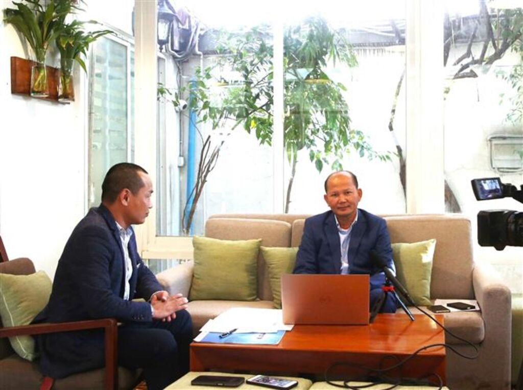 | Uch Leang (droite) lors d'une interview de l'Agence Vietnamienne d'Information. |