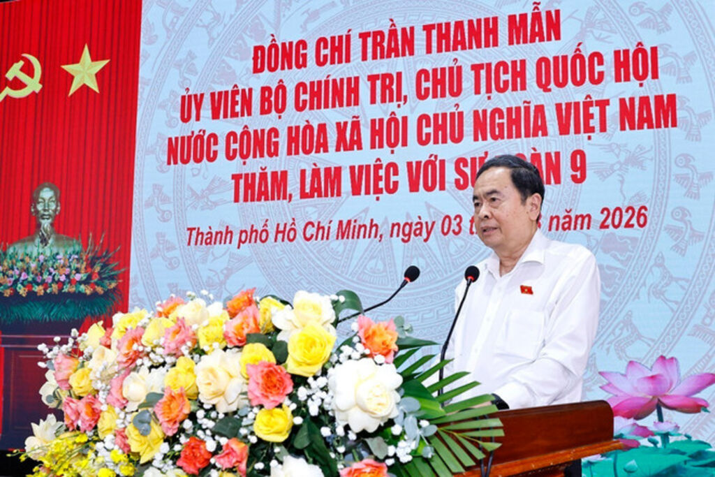| Le président de l’Assemblée nationale, Trân Thanh Mân, s’exprime lors de la réunion avec la 9e division du 34e corps d’armée, à à Hô Chi Minh-Ville, le 3 mars 2026. |