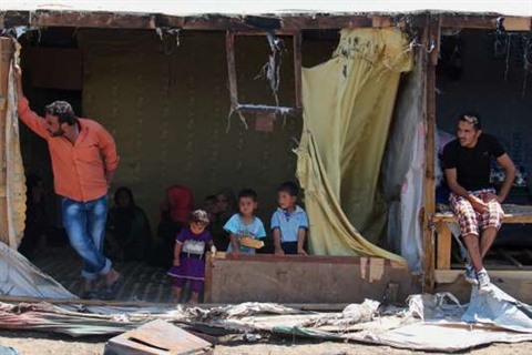 | Des réfugiés syriens dans leur camp gravement endommagé par un incendie, à Bar Elias, dans la vallée de la Bekaa (Liban). |