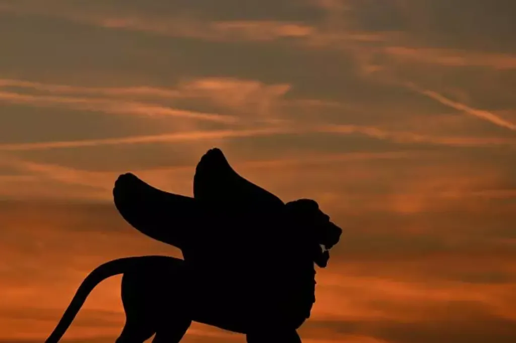 | Un lion ailé, symbole de la Mostra de Venise, le 5 septembre 2023 sur le Lido de Venise. |