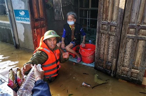 | Distribution de l'eau potable et des nourritures aux populations sinistrées dans la province de Quang Binh, le 23 octobre. |