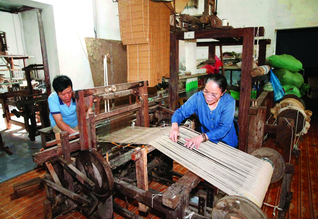 | Tissage de la soie à partir de fibre de lotus dans l’établissement de Mme Thuân. |