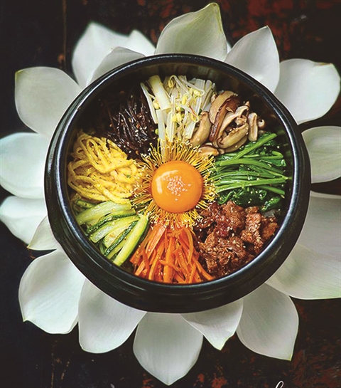 À côté de ce plat, chaud, Phan Anh a créé un plat froid avec les mêmes ingrédients. Sa présentation était tout aussi originale : le riz aux graines de lotus était disposé au cœur d’une assiette, agrémenté d’un jaune d’œuf sur le dessus. Les bords de l’assiette étaient couverts de pétales de lotus qui contenaient chacun l’un des ingrédients qui constitue le Bibimbap.