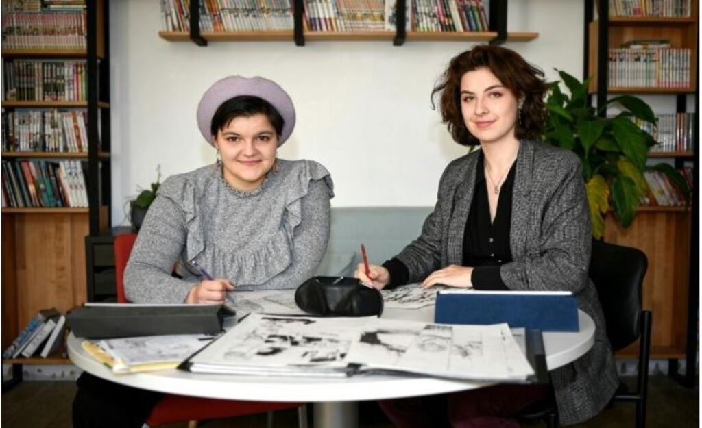 | Les étudiantes Séléna Mercier et Marie Desnoyer de l'Eima, travaillent sur leur premier manga "Réseau Alexis". |