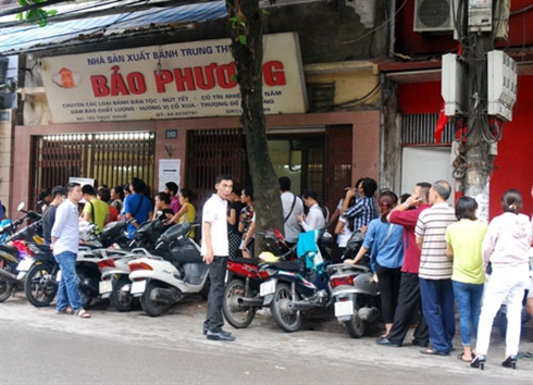 | Beaucoup de gens font la queue devant le magasin Bao Phuong sur la rue de Thuy Khuê pour acheter ses gâteaux de la lune. |