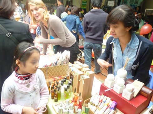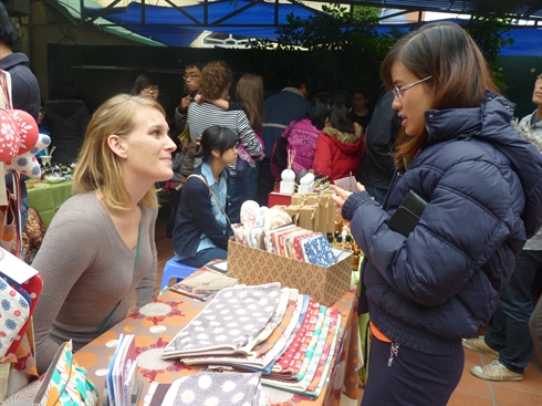 De nombreuses boutiques de Hanoi exposaient ici leurs produits spéciaux de Noël, pour 150.000 dôngs le stand : des vêtements, des serviettes de table en coton organique, des diffuseurs de parfums, des accessoires chauds pour l’hiver, des décorations pour la maison ou encore des cartes de voeux ou des céramiques faites mains. On trouvait aussi des jeunes qui revendaient leurs vêtements inutilisés, comme Sébastien, 25 ans, Français, qui se débarrasse de plusieurs de ses pulls et vestes.