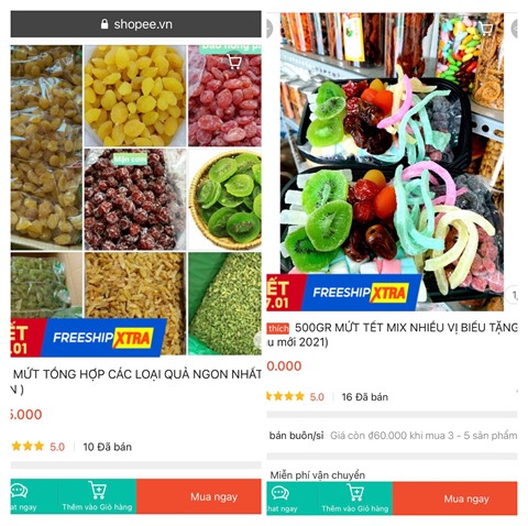 | Des confiseries vietnamiennes à base de fruits proposées pour le Têt 2021 sur le site de vente en ligne Shopee. |